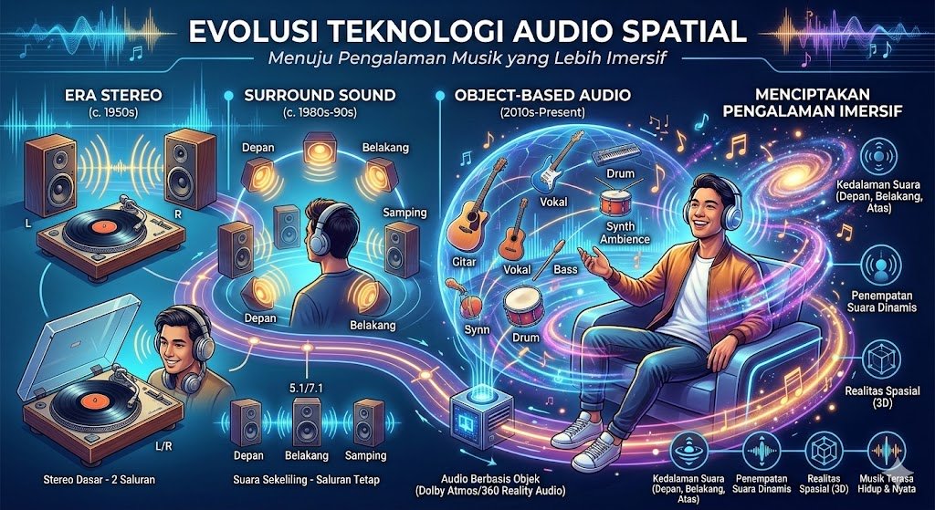 Dunia audio telah mengalami transformasi luar biasa dari era mono yang sederhana menuju pengalaman tiga dimensi yang kini kita kenal sebagai audio spatial. Teknologi ini bukan sekadar tren sesaat, melainkan lompatan besar dalam cara manusia mengonsumsi karya seni suara. Jika dahulu pendengar hanya merasa suara datang dari arah kiri dan kanan melalui sistem stereo, kini audio spatial memungkinkan setiap instrumen dan vokal diposisikan secara presisi di ruang virtual di sekitar pendengar. Inovasi ini menciptakan kedalaman, tinggi, dan dimensi yang membuat pendengar merasa seolah-olah berada di tengah panggung bersama para musisi.
