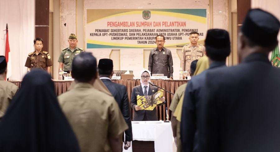 LUWU UTARA, Nadinewsonline.com – Bupati Kabupaten Luwu Utara, Indah Putri Indriani secara resmi mengambil sumpah dan melantik Baharuddin Nurdin sebagai Penjabat Sekretaris Daerah (Sekda), di Aula La Galigo, Selasa (16/01/2024).